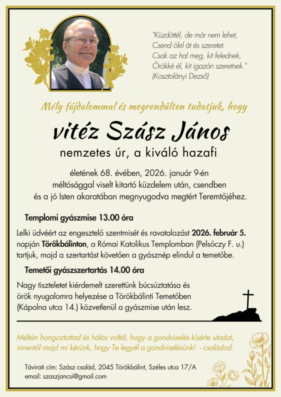 Mély fájdalommal, de Isten akaratában megnyugodva tudatja a Vitézi Rend Pest Vármegyei Törzskapitánysága, hogy vitéz Szász János nemzetes úr 2026. január 9-én, életének 68. évében megtért a Teremtőjéhez. Isten vigasztaló szeretetét kívánjuk a gyászoló családnak és a hozzátartozóknak! Boldog nyugalmat és örök emléket!